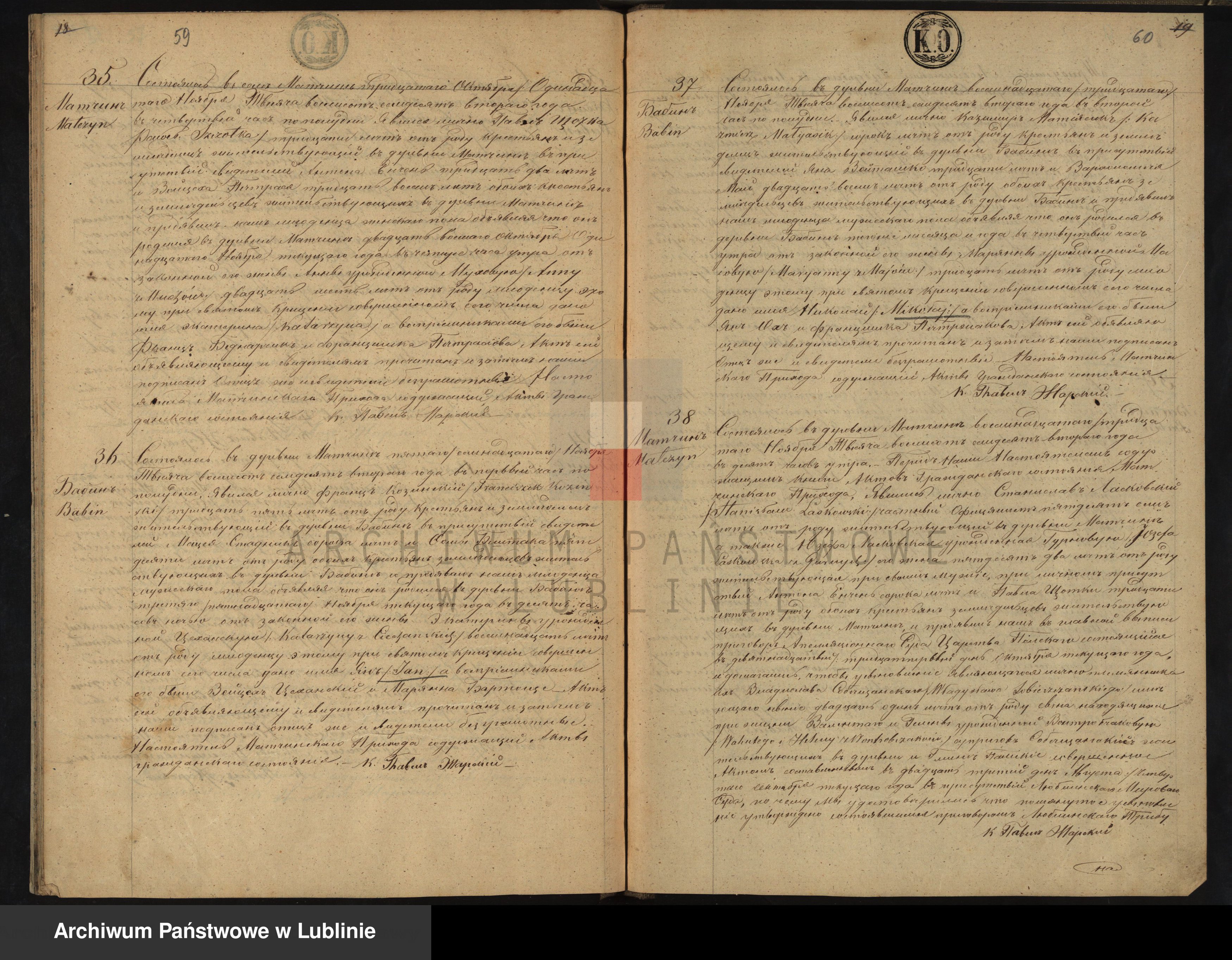 | Stanisław Laskowski l.57 oficjalista zamieszkały w Matczynie wraz z żoną Józefą z Górnych Laskowską l.52 przedstawili orzeczenie Sądu Królestwa Polskiego z 30.10.1872 o usynowieniu Władysława Sobieszczańskiego | ||